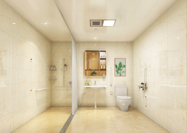 Extremely spacious bathrooms have been designed for the elderly to move freely inside and out; installed linear shower drain instead of traditional glass partitions to ensure their safety.