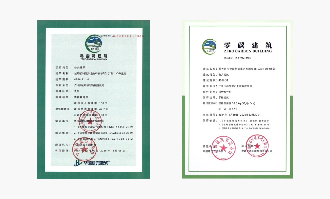 Under the guidance of the Technical Standard for Near-Zero Energy Consumption Buildings (GB/T51350-2019), Nansha Intelligent Manufacturing Production Base Phase II, as the leading industrial park project in China, has obtained the Zero-Carbon Design Certification and the Zero-Energy Consumption Design Certification, and it is also the first industrial park project of Yuexiu Property to obtain the “Dual-Zero” certification.