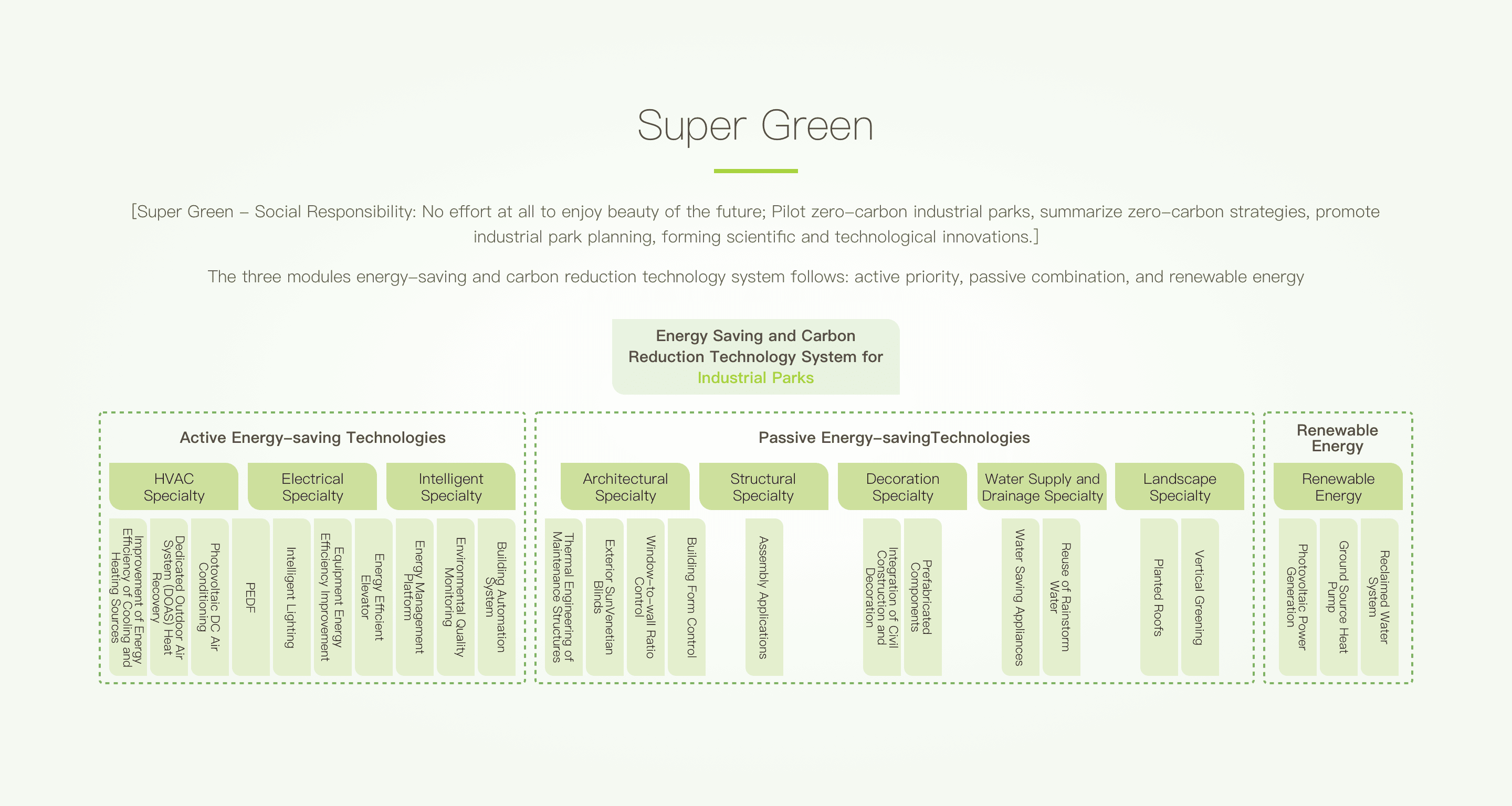 With the goal of sustainable development, the Yuexiu iPARK Guangdong-Hong Kong Cloud Valley Project plans a spatial layout of “one corridor, two districts and three nodes” according to the local climate characteristics. It has also been designed to comprehensively reduce the building’s energy consumption through 12 special technologies, such as active-passive energy-saving technologies, renewable energy resource utilization, and the application of new product technologies, and achieving an energy-saving rate of 47.7%, a comprehensive energy-saving rate of 100%, a renewable energy utilization rate of 108%, and a final annual building energy consumption level of 34 kW-h/㎡.a.